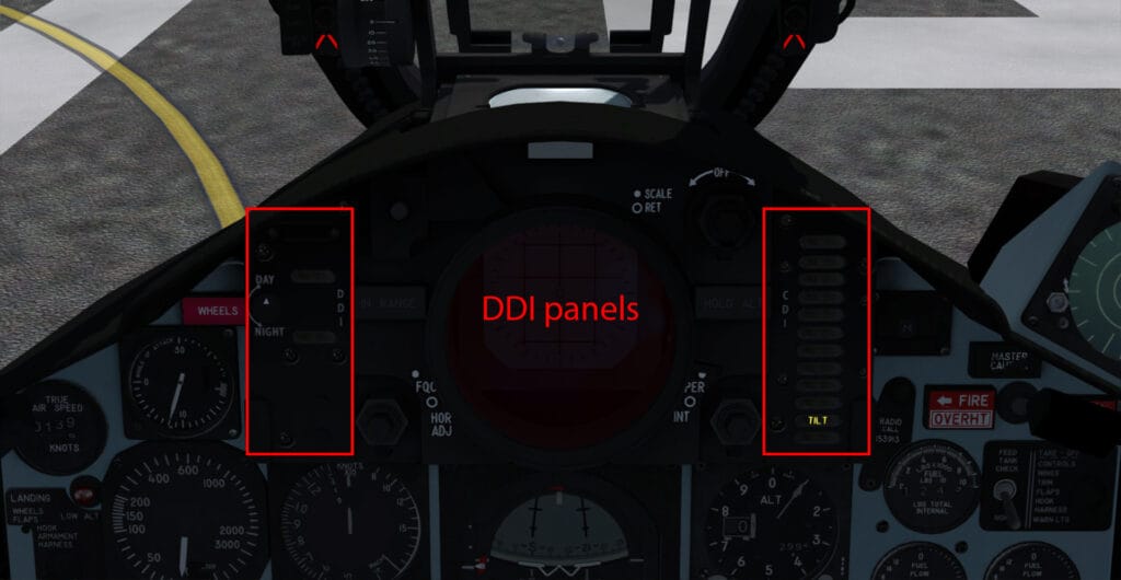 The DDI annunciator lights are located on both sides of the RADAR scope in the forward cockpit. DDI lights provide the pilot with information during an ACLS approach.