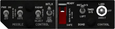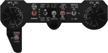 The bomb control panel (also called dogbone) is located forward of the control stick. It is used to select the active stations and release modes for air-to-ground weapons as well jettisoning from all stations. From left to right the functions are
