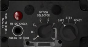 The AWW-1 fuze panel is located on the right console. It is used to turn bomb fuzes on and off. This is done by setting the power knob to STBY or READY for 30 seconds.