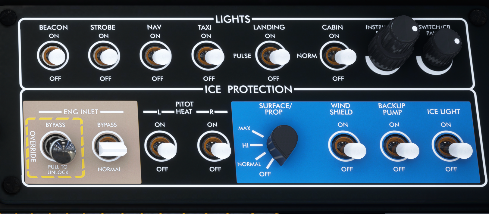 The aircraft cabin is split into two zones, pilot and passenger, each with its individual climate controls. The airplane is equipped with four air conditioning nozzles on the main panel and one overhead of each passenger. Additionally, eight electrical heating devices are provided, located on the walls near the floor. The entire system is powered by the Auxiliary Power Bus, which can be toggled using the AUX BUS switch.