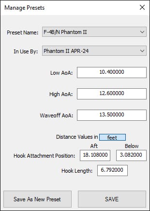 - Preset activator: The drop-down menu allows you to select an aircraft preset to be applied to the selected aircraft. The three checkboxes will enable the Deck Configuration gauge for our carriers (see here), allowing you to show and hide static aircraft.