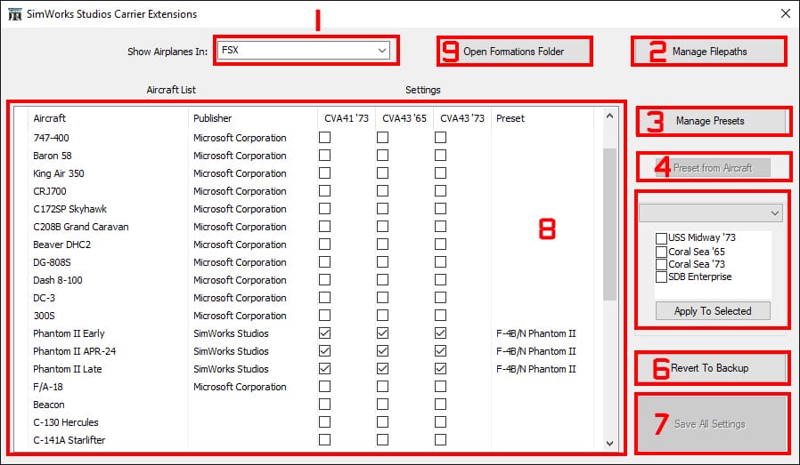 - Clicking on the checkboxes under carrier names will install the deck configuration for the respective carrier in that aircraft’s panel
