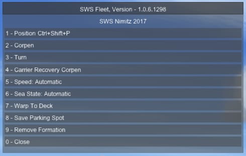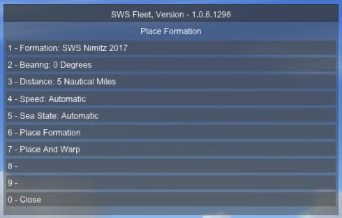 If you save your flight through the normal simulator interface while a SWS Fleets formation is present, the formation data will also be saved. When you load the saved flight the formation will automatically be placed at its saved position, course and speed. If your aircraft was on the deck of a ship when the flight was saved you will automatically be warped to this point on the deck.