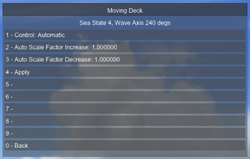 - Sea state: changes the sea state of the formation. if “automatic” is selected the ships pitch and roll according to prevailing weather conditions. Scaling factors are present to allow you to pronounce or reduce the natural motion of the ships if desired. If Manual mode is selected, you will be able to select the sea state from calm (0) through gale force (9). You will also be able to select the axis of the wind. Clicking execute will activate the selected state.