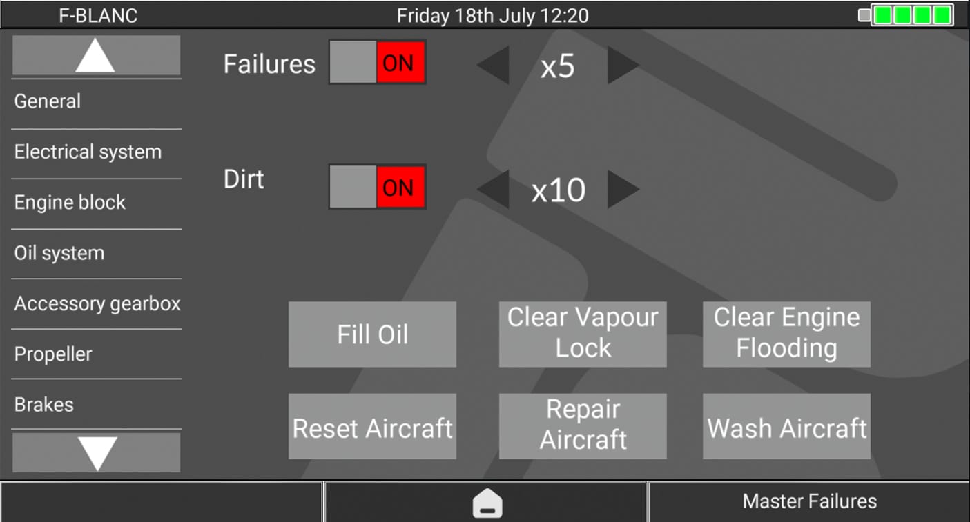 Simulate more than 70 possible failures on multiple systems, including cascading ones! Did you oil pump fail? Watch as your engine starts overheating and your propeller starts overspeeding. Does your RPM indicate 0 but the propeller is still going? Check your oil pressure, vacuum gyro and voltages. Your accessory gearbox is out!